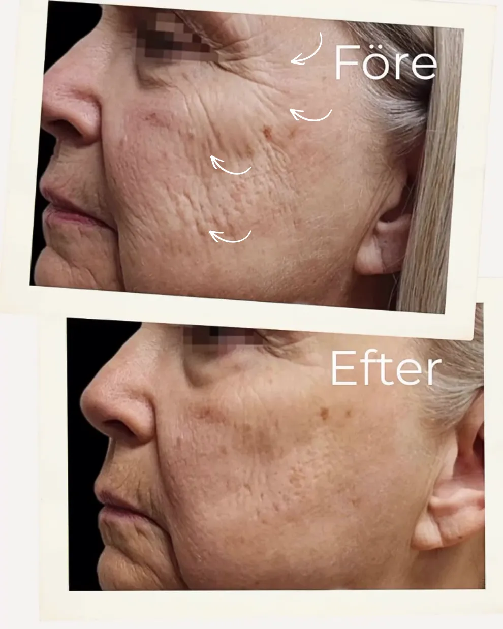 Behandlingen förbättrar hudens fasthet och elasticitet genom att öka kollagenproduktionen, vilket ger huden ett slätare och mer jämnt utseende.